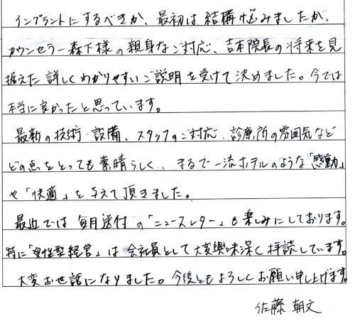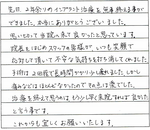 先日、2年余りのインプラント治療を無事終える事ができました。本当にありがとうございました。