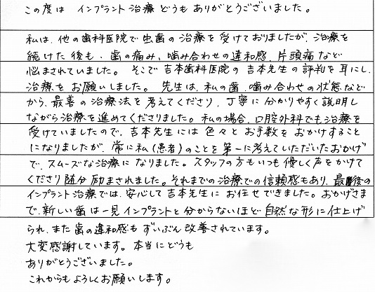 また、インプラント手術当日も「吉本歯科医院は勝手知ったるなじんだ病院だし、院長先生やスタッフの方も顔見知りの方ばかりなのでとてもリラックスして手術にのぞめた」とのこと。