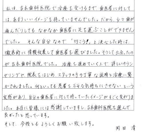 「以前は、いわゆる昔ながらの削っては詰めてではい終わりの歯医者さんに数件通っていたが、吉本歯科医院は、まず入ってからの雰囲気がまず違う。迎えてく れる気持ちが伝わってきてとてもリラックスできる。院長の丁寧な説明にも感動している。これからの新しい歯医者さん像だと思った」と、おっしゃって下さい ました(^^)