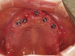 総入れ歯をされていた患者さまの場合は、その入れ歯を使い続けていたことによる骨や歯茎が退縮しやせてしまっている。インプラントを入れても半年間はまともに咬むことができない場合が多い。