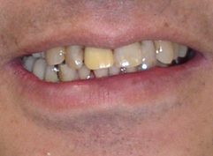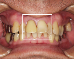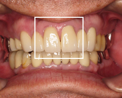 B下の前歯の歯肉の位置を下げる外科的治療を行い、上の前歯の被せ物をセラミックにやりかえを行なった。