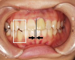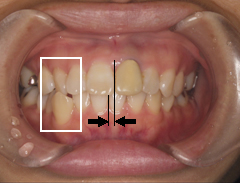 右下、糸切り歯の噛み合わせ(咬み合わせ)が上下逆になっている状態