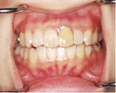一見、悪くないようにみえますが、噛み合わせの位置が後方にずれて、低くなったために、前歯に負担がかかり前方に飛び出てきています。(上の前歯が出っ歯になっています)