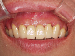 歯周病の進行と舌圧の強さにより、下の前歯が前に飛び出てきてしまい上の前歯とぶつかるようになってきた。そのため咬む力によって歯が欠けてしまっている。