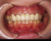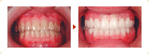 (他医院で自由診療でセラミックの治療を行っている 上の前歯2本) 上の前歯、歯茎との境目が露骨で、白さ、形が不自然です。明らかに被せものをしているとわかってしまいます。 |