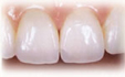 (吉本歯科医院でのセラミックの治療をやりかえた完成写真 上の前歯2本) 歯茎との境目に違和感がなく、ご自分の歯のように見えます。治療していない両隣の歯の色、風合いに合わせて被せものをつけています。 |